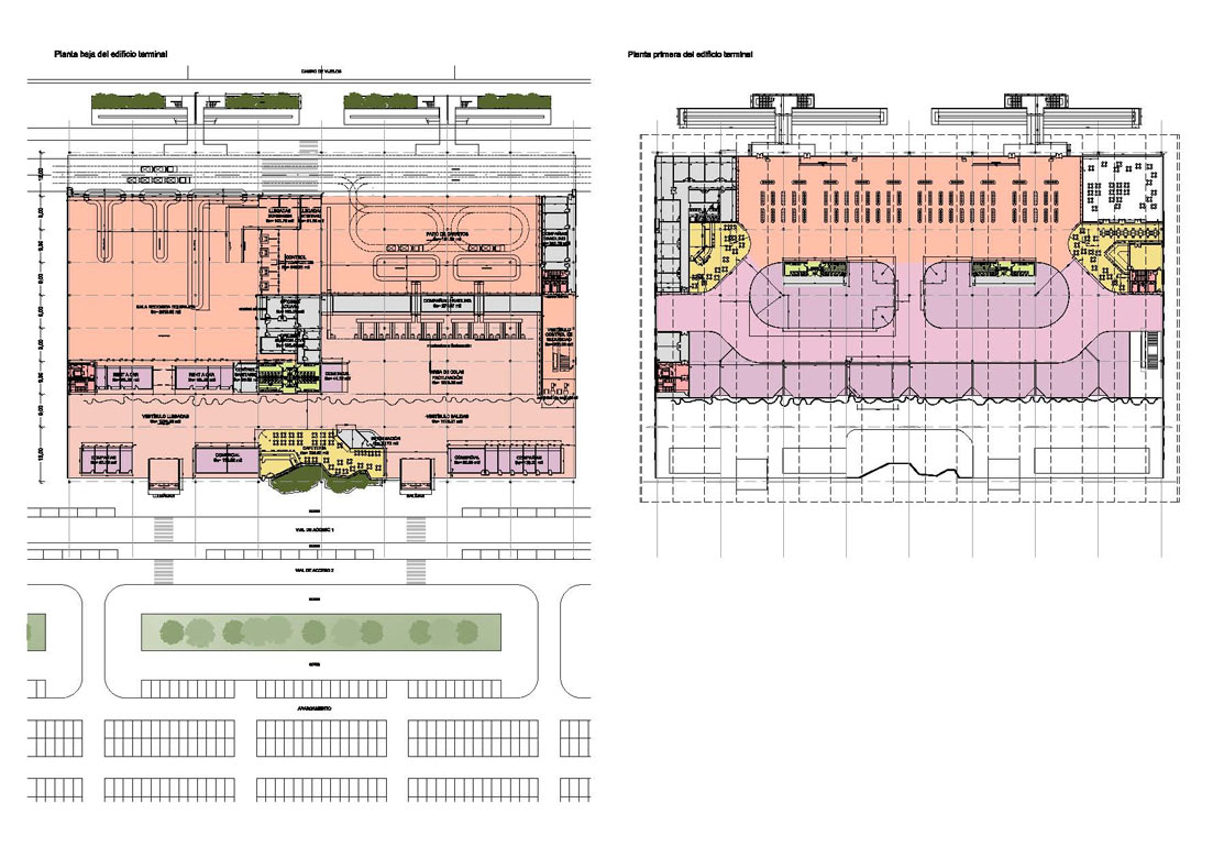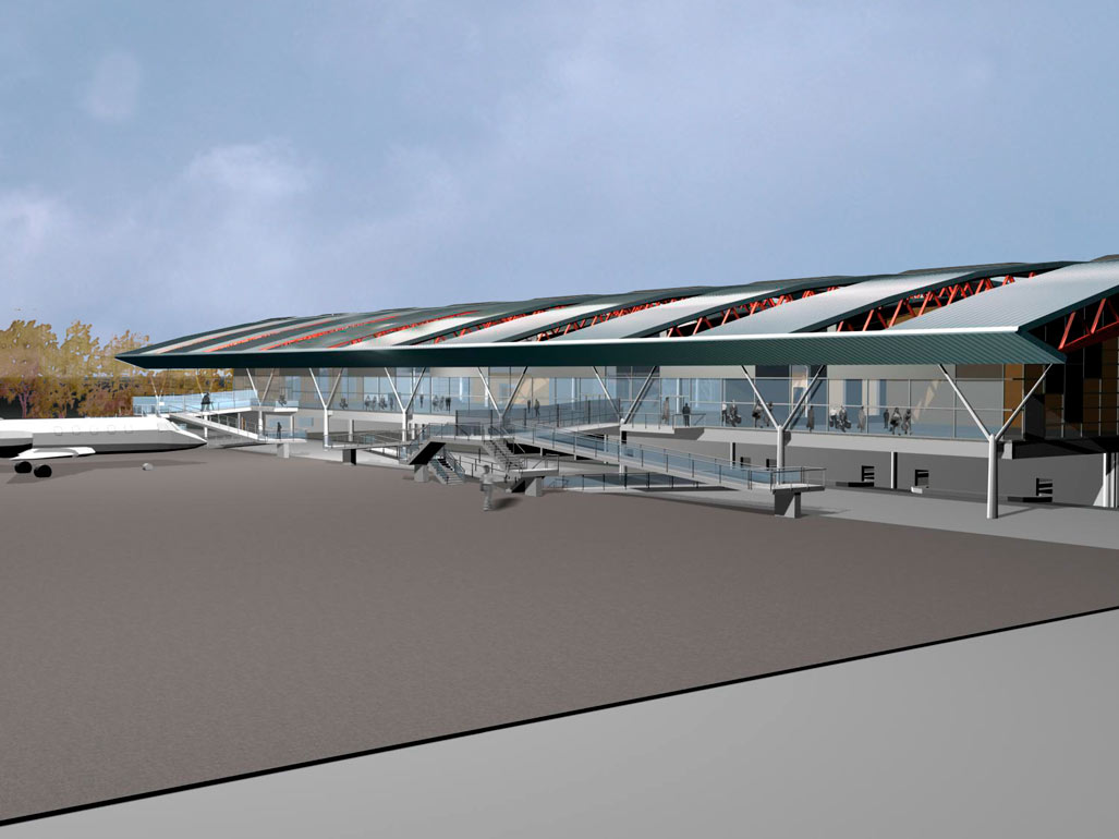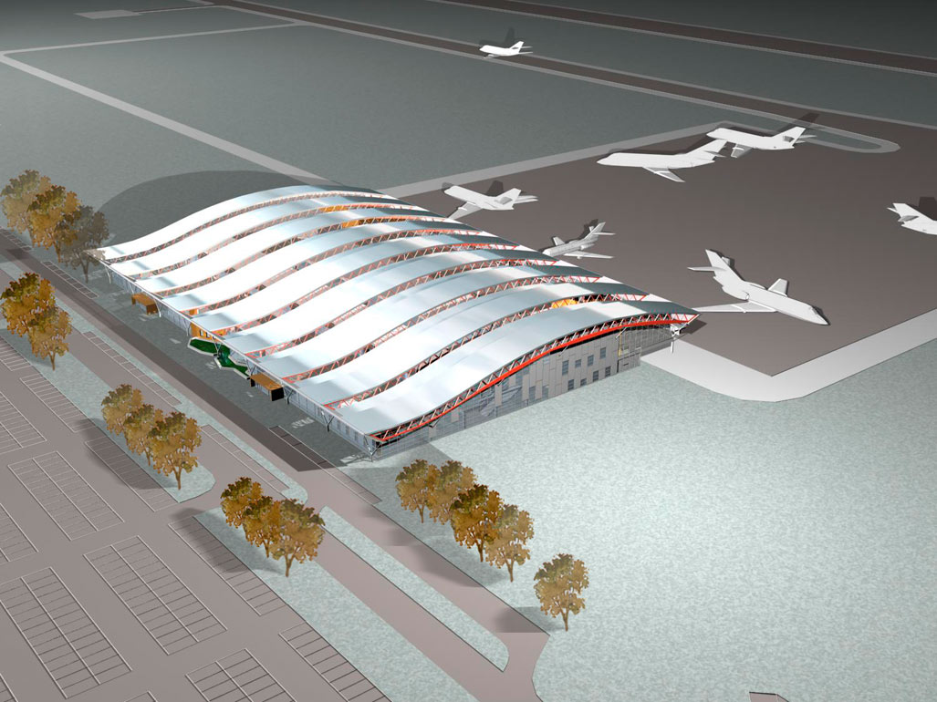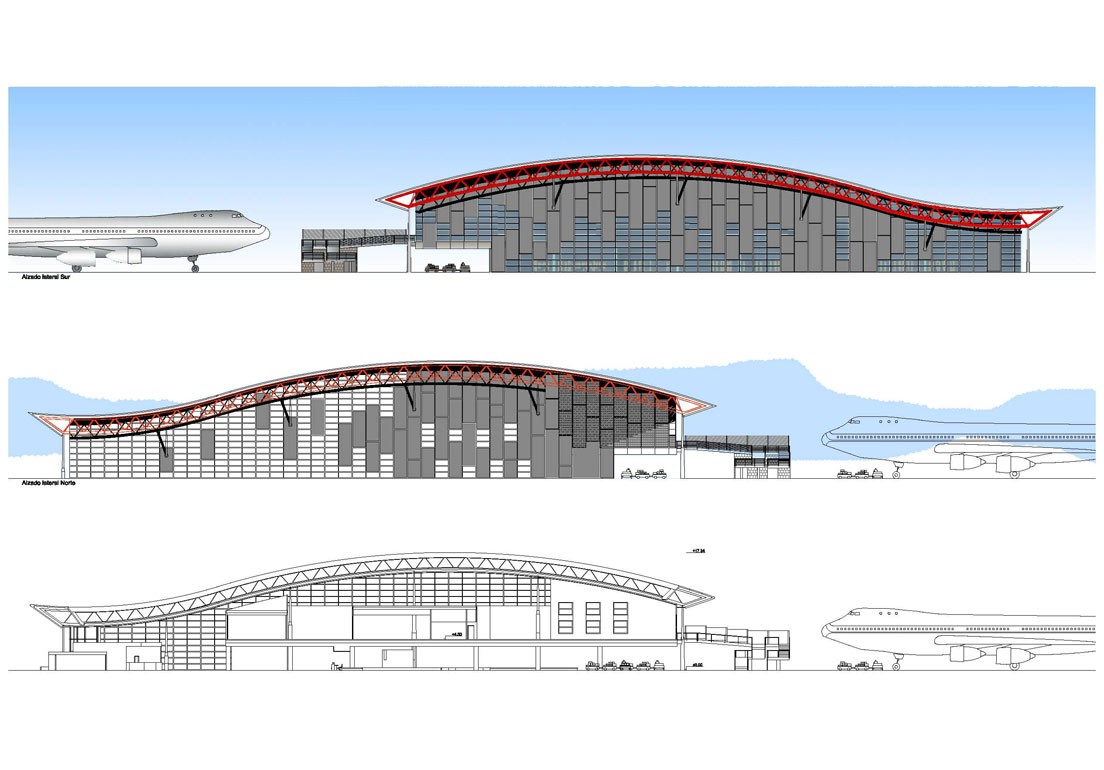 Se diseña una cubierta emblemática, ondulada y de grandes luces, que se convierte en la seña de identidad del edificio. La cubierta representa el movimiento y dinamismo del espacio aeroportuario, permitiendo al mismo tiempo la entrada de luz a través de los paños verticales que se disponen entre los niveles superior e inferior alternos de la cubierta.