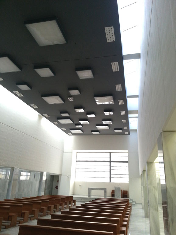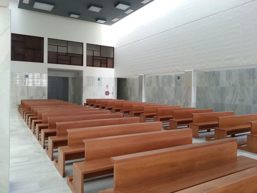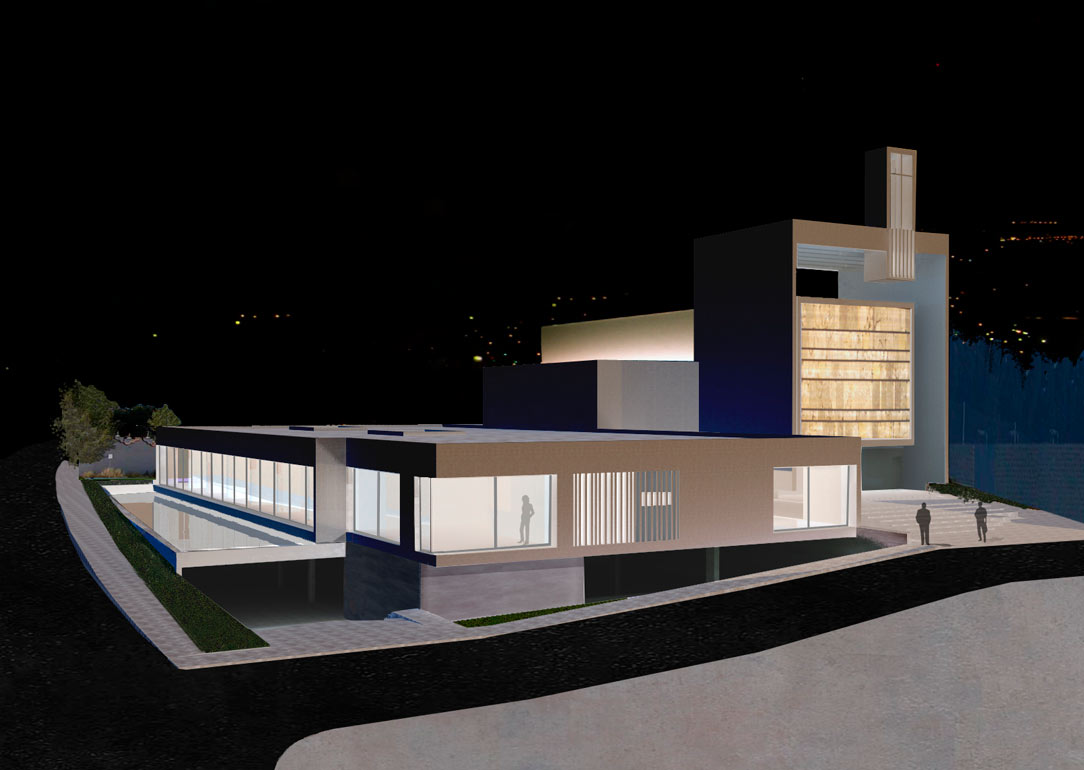 Se establece un diálogo entre los dos volúmenes diseñados para cada uno de los programas funcionales, con un espacio de uso oratorio multiconfesional de transición entre ambos.