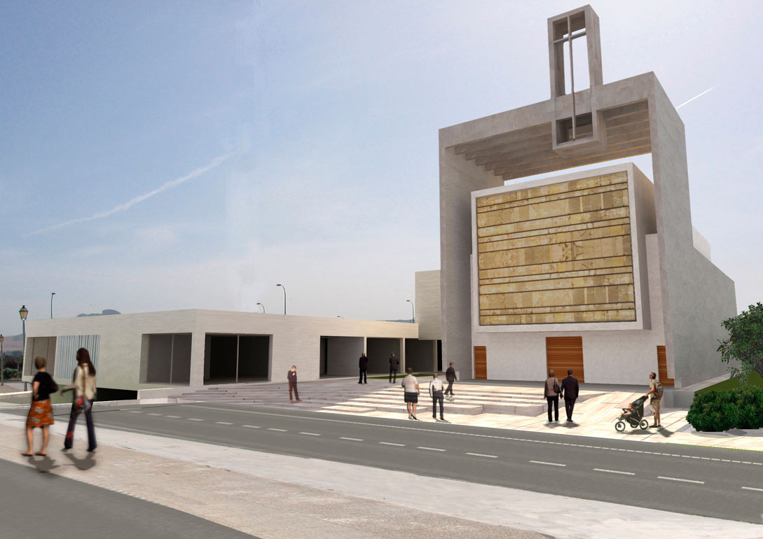 La horizontalidad del tanatorio contrasta con la verticalidad de la iglesia.