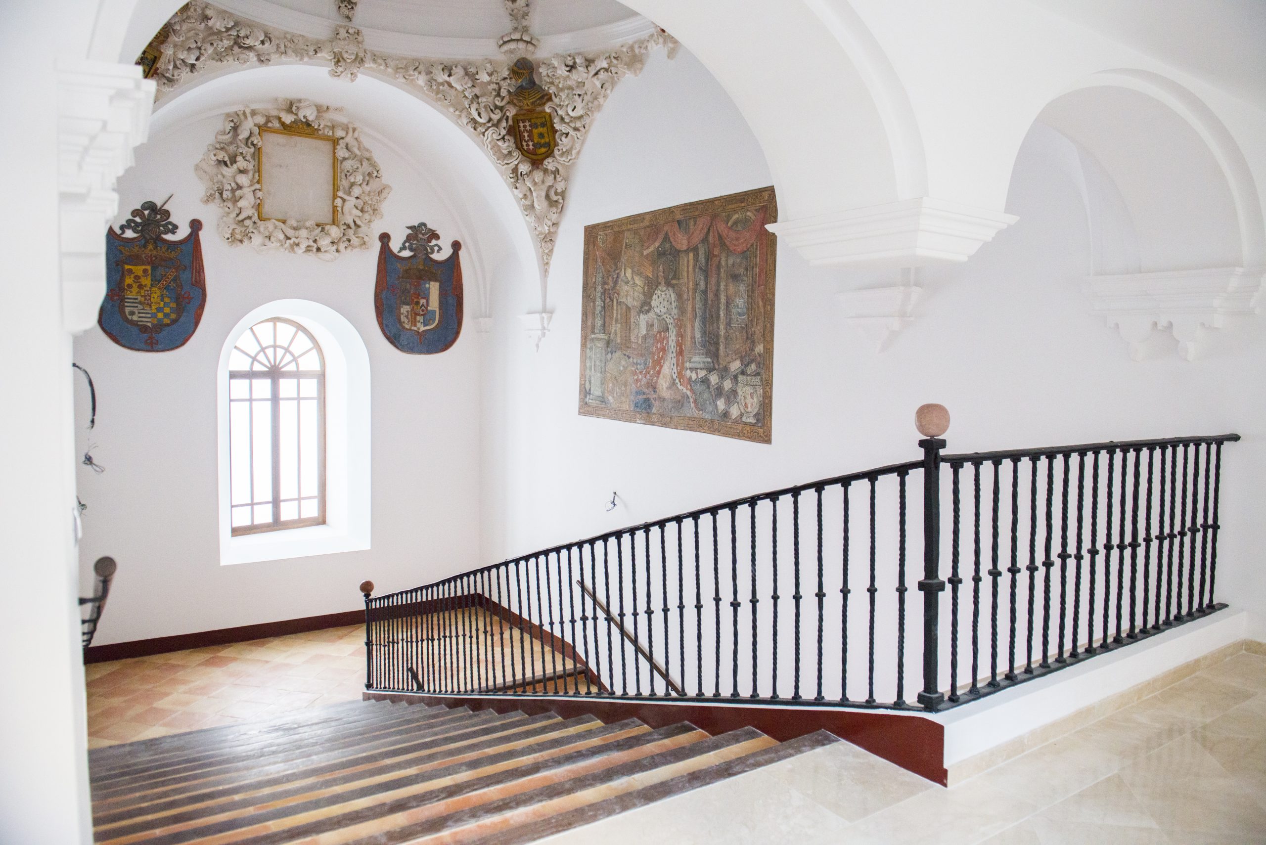 La caja de escalera presenta planta rectangular y doble tramo de ida y vuelta, con baranda de hierro y remates de mármol local. Se cubre con una cúpula circular decorada con yeserías en las pechinas, tiene como elemento más original los frescos que se ubican en los muros que conforman la caja de escalera, así como diversos escudos heráldicos.