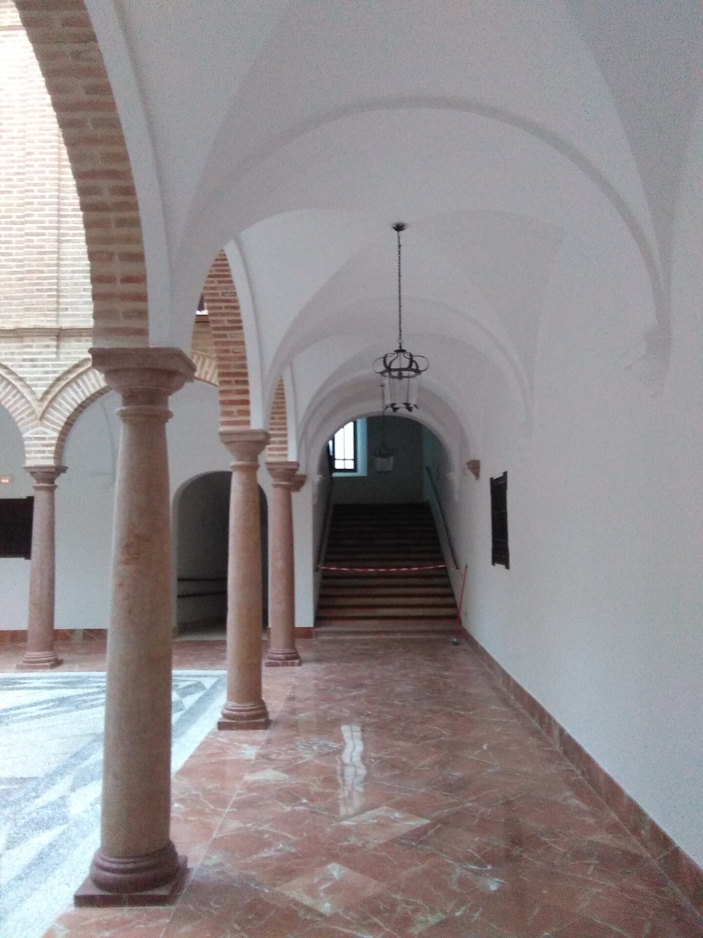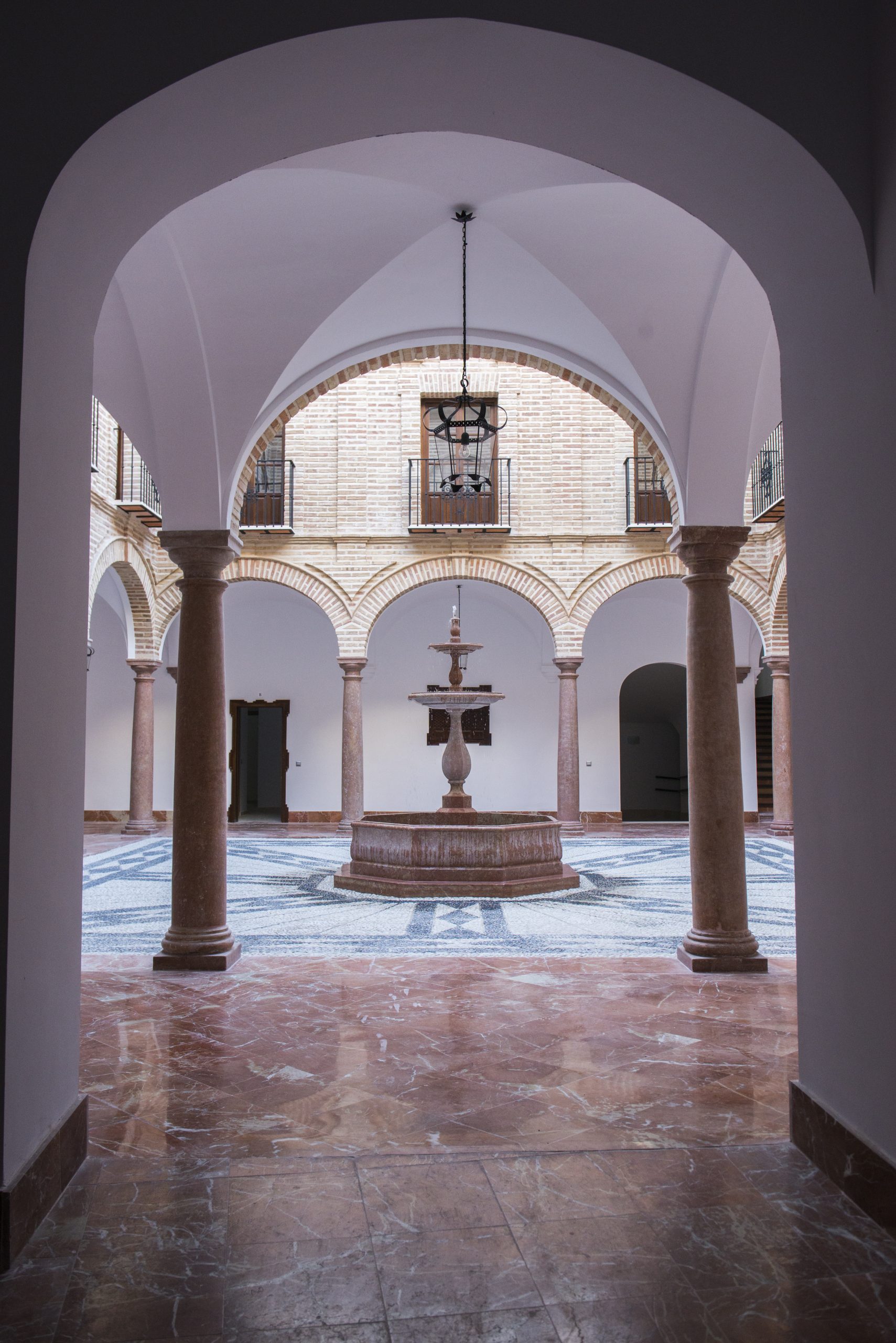 El patio central, de planta cuadrada, desarrolla en cada uno de sus cuatro frentes una triple arcada sobre columnas toscanas de caliza roja del torcal.