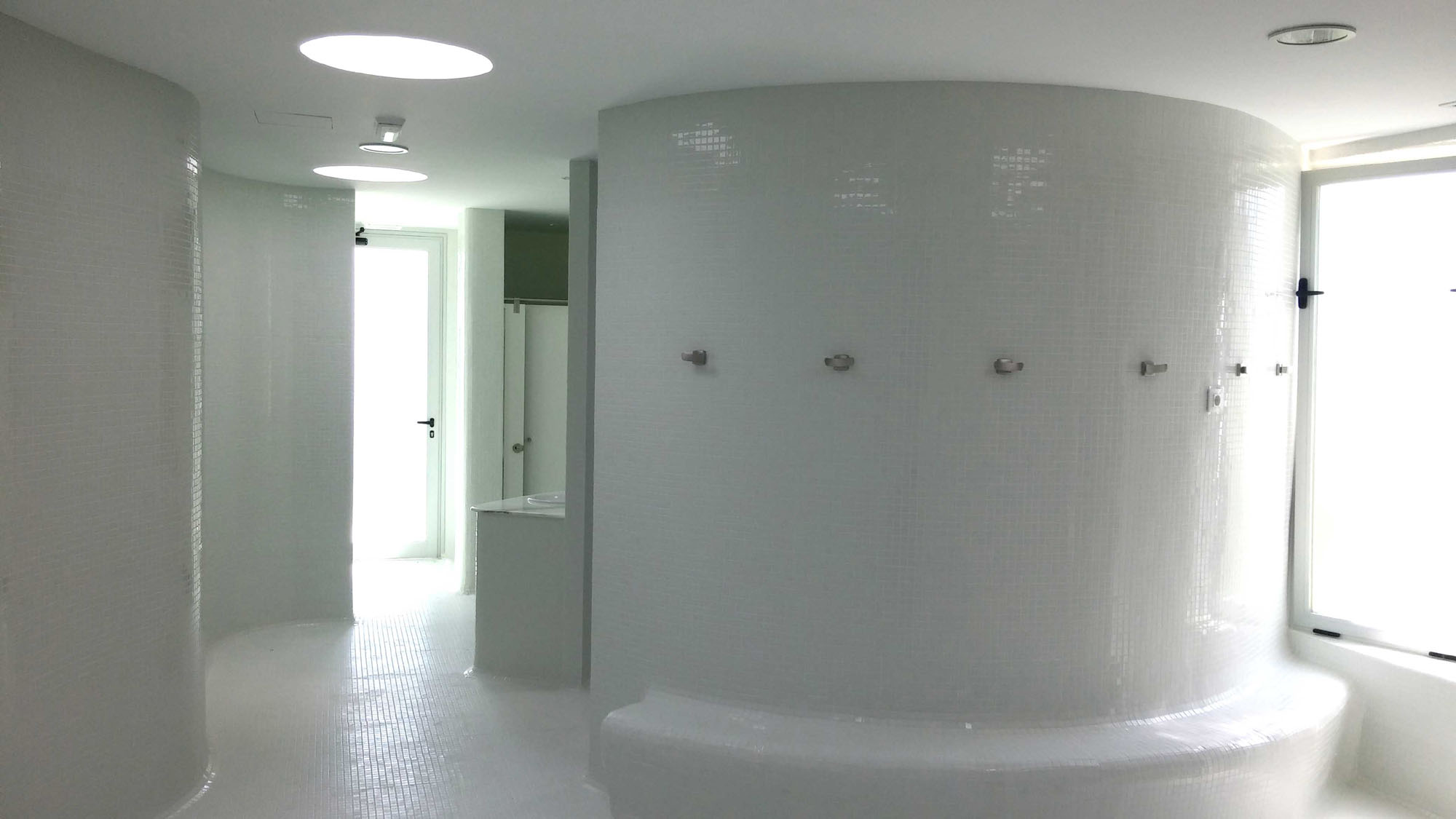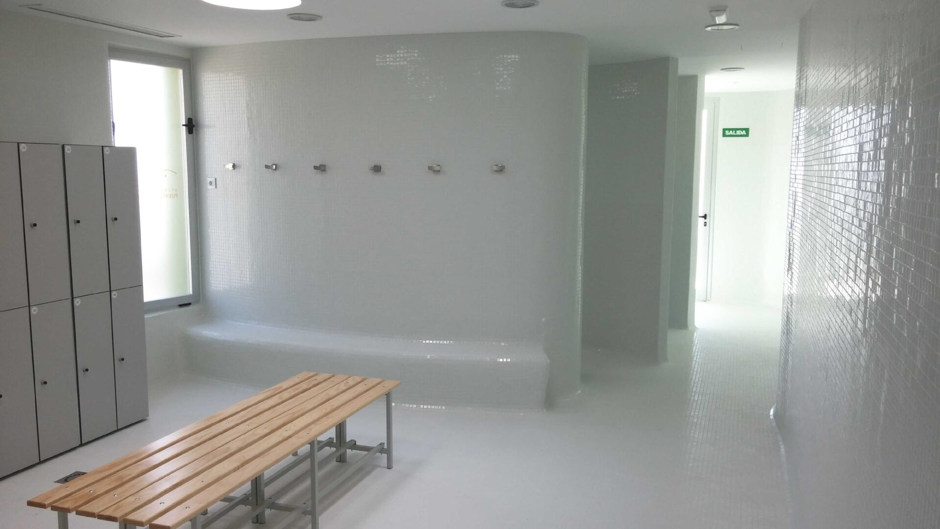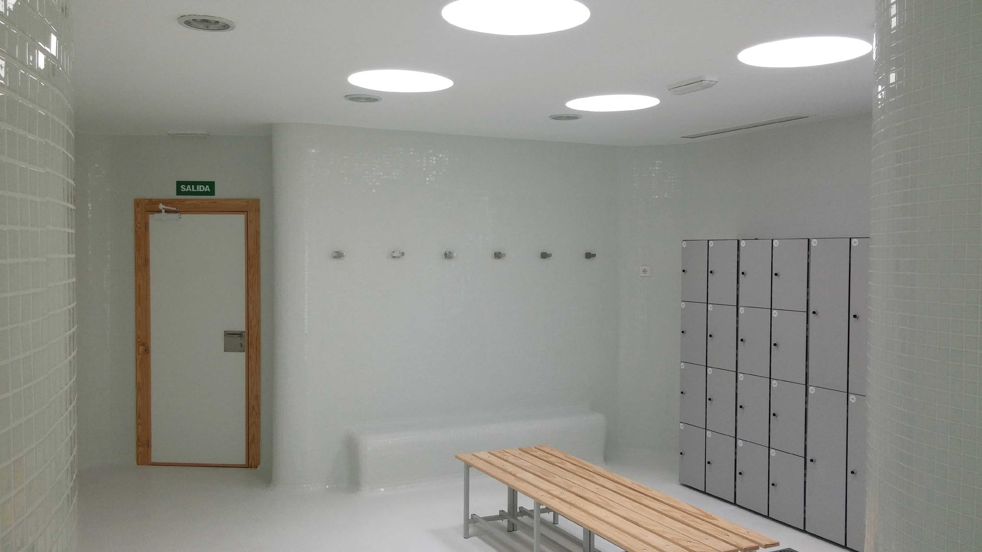 Respecto al edificio de vestuarios, con planta rectangular y trama estructural de retícula de pilares, se ha remodelado la fachada utilizando una combinación de colores en tonos verdes que evocan la naturaleza. En su diseño interior priman las formas curvas, en esa búsqueda de lo orgánico. La luz tiene un papel protagonista gracias a los lucernarios, consiguiéndose espacios con mucha claridad y energéticamente eficientes, ya que durante el día el consumo eléctrico en iluminación es cero a pesar de tratarse de vestuarios, que suelen tener poca iluminación natural por ser necesaria la intimidad de los usuarios. Se ha utilizado el mismo material, gresite blanco, en paredes y suelos, siendo los encuentros redondeados para dar continuidad a esa transición.