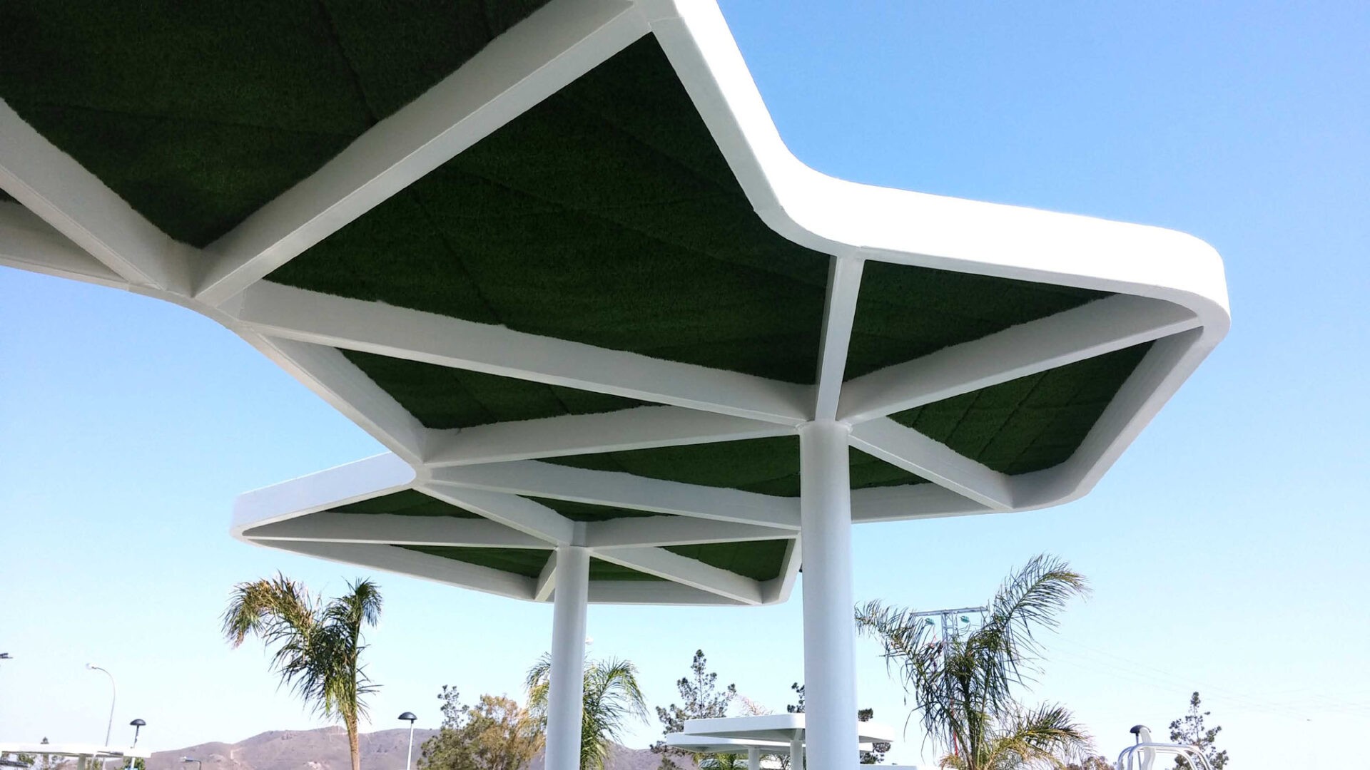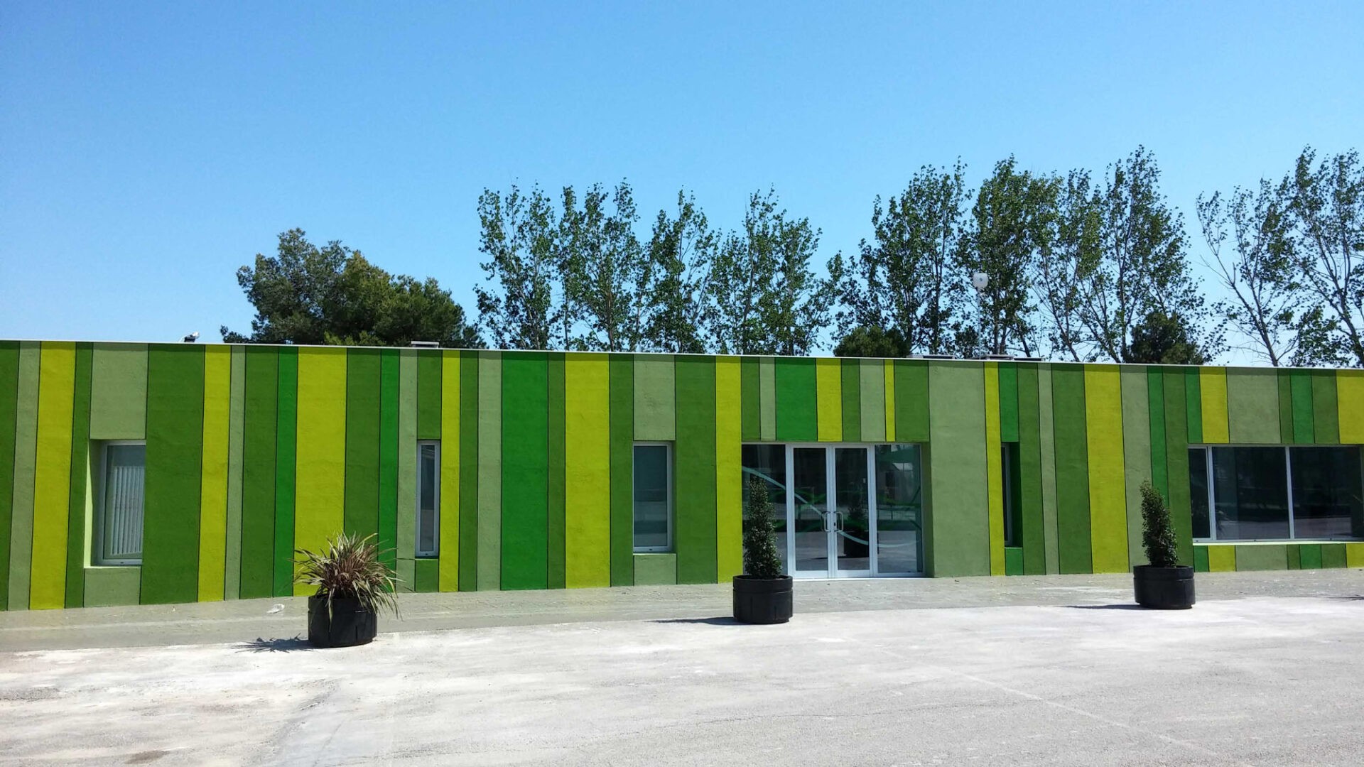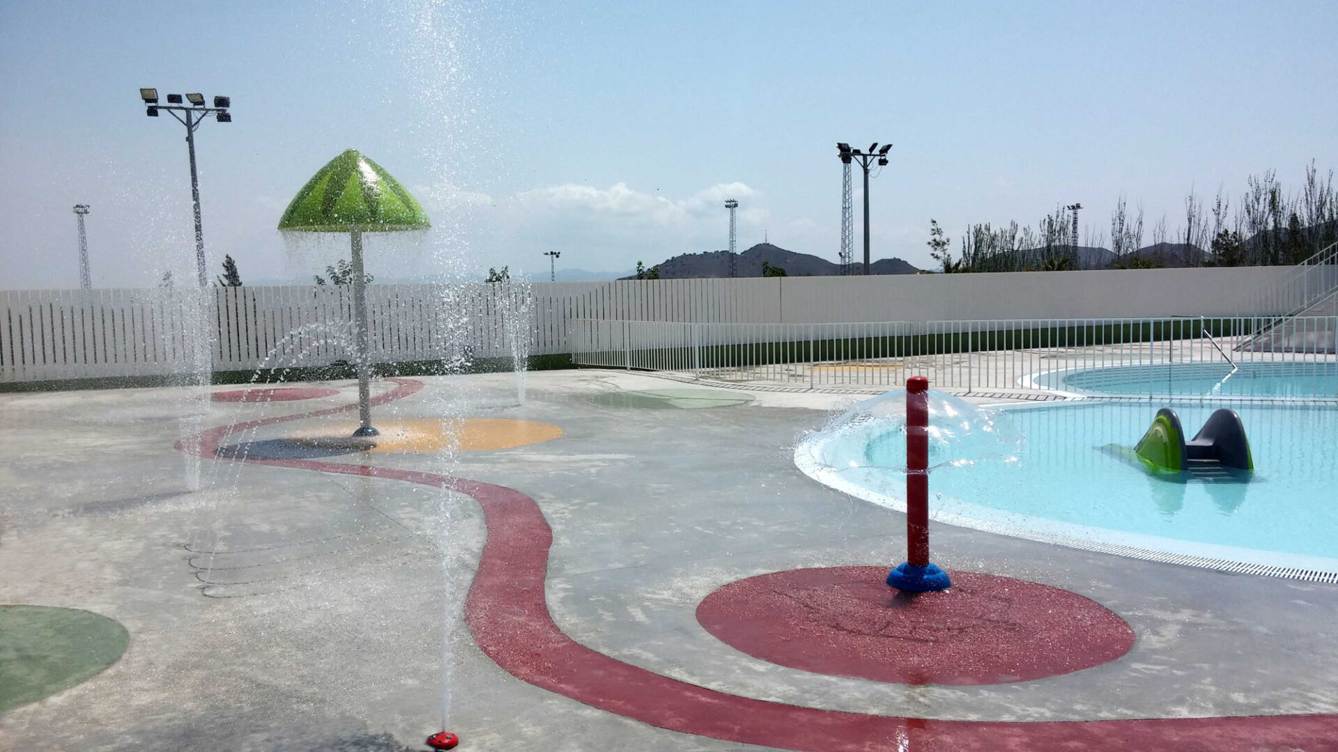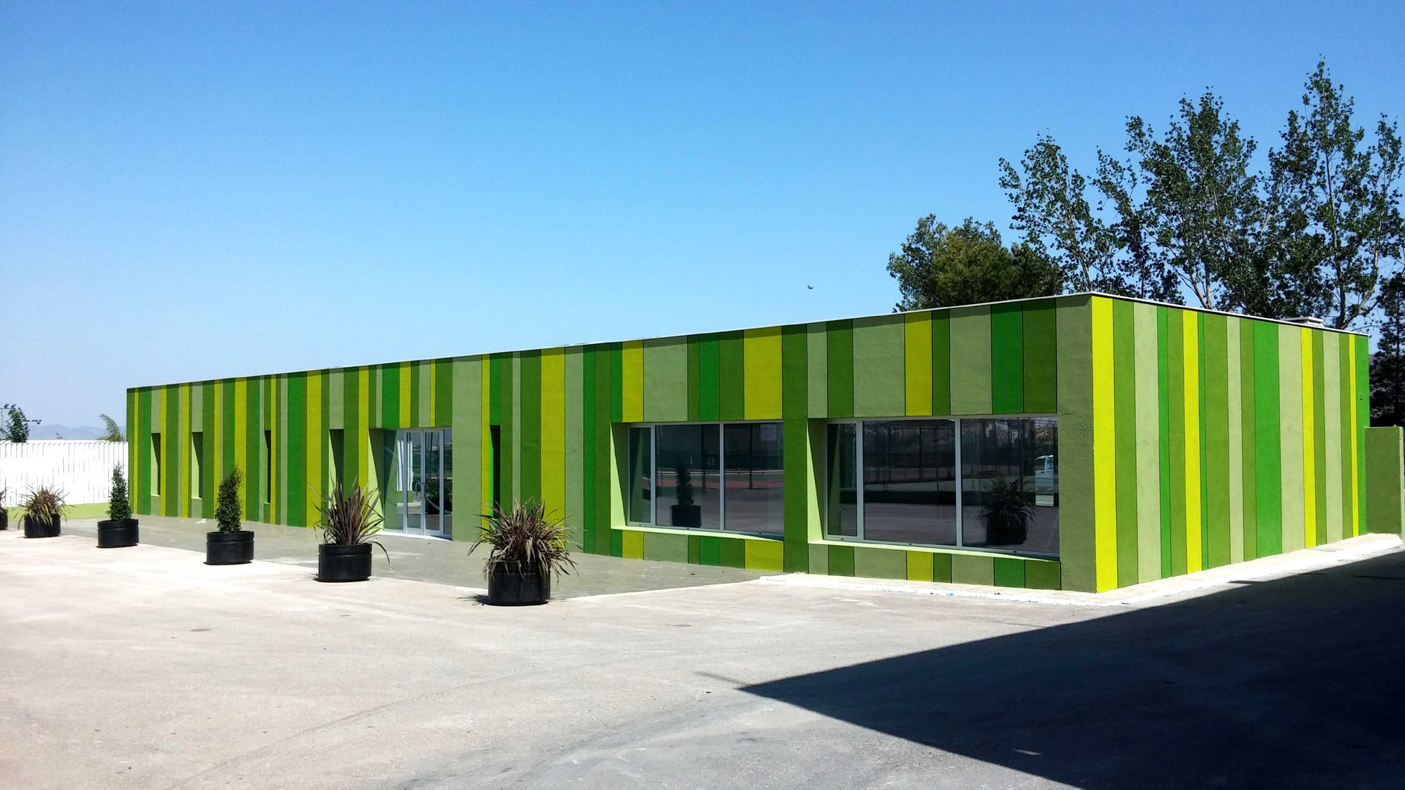 La premisa del proyecto fue la integración del conjunto en el entorno natural en el que se encuentra, para lo cual se utilizaron diferentes recursos arquitectónicos. Respecto al recinto de piscinas, éste se encuentra salpicado de pérgolas con formas orgánicas que recuerdan a árboles por su configuración de un tronco y sus ramas. El material de cubrición de las pérgolas es césped artificial, consiguiéndose un efecto de espejo que se percibe cuando uno se sitúa uno debajo de una de ellas, ya que da la sensación de que el césped del suelo se proyecta en las pérgolas. Éstas se alternan con cocoteros y moreras, especies cuyas raíces no son expansivas y por tanto no dañan los vasos de las piscinas, y que acentúan la sensación de estar en un espacio natural. El vallado en color blanco de perfiles rectangulares de acero girados sobre su eje permite la necesaria privacidad ya que dificulta la vista desde el exterior, pero al mismo tiempo tiene cierta permeabilidad, no ejerciendo una barrera total como lo haría una valla ciega.